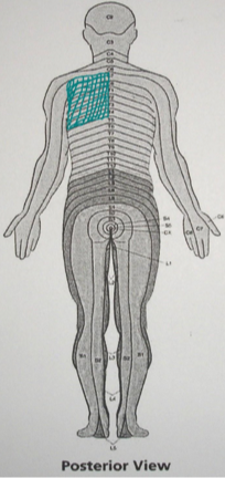 Εικόνα 24.1. Το σχεδιάγραμμα περιγράφει την κατανομή του πόνου της ασθενούς στην ωμοπλάτη και στην περιοχή κάτω από την ωμοπλάτη δεξιά. υποκλείδιο χώρα, στο άνω άκρο, στον ώμο και στην ωμοπλάτη δεξιά (24.1).