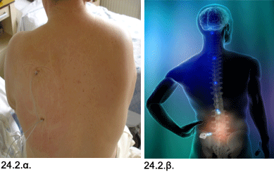 Εικόνες 24.2.α. & 24.2.β. Φωτογραφία του οπίσθιου θωρακικού τοιχώματος δείχνει την διαδερμική τοποθέτηση των κυλινδρικών ηλεκτροδίων προσωρινής δοκιμαστικής διέγερσης περιφερικού νευρικού πεδίου (24.2.α.). Το σχεδιάγραμμα δεξιά απεικονίζει την “αρχή λειτουργίας” της ηλεκτρικής διέγερσης για έλεγχο του πόνου, με παρεμβολή του ηλεκτροδίου και αναχαίτιση της μετάδοσης - μέσω των νευρών και του νωτιαίου μυελού - του ηλεκτρικού σήματος, που είναι ο “φορέας του μηνύματος του πόνου” στον εγκέφαλο (24.2.β.).