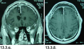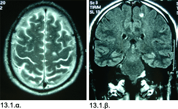 Εικόνες 13.1.α. & 13.1.β. Μαγνητική τομογραφία αναδεικνύει μικρή στρογγυλή (λευκάζουσα) περιοχή υψηλού σήματος στην έσω μετωπιαία περιοχή σε εγκάρσια (1α) και στεφανιαία προβολή (1β).