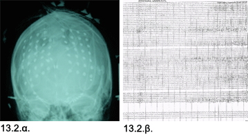 Εικόνες 13.2.α. & 13.2.β. Απλή ακτινογραφία που δείχνει την διάταξη των καταγραφικών ηλεκτροδίων στη κεφαλή (13.2.α.) και τμήμα του διεγχειρητικού ηλεκτροεγκεφαλογραφήματος που δείχνει τις αιχμές που υποδηλώνουν την έναρξη της επιληπτικής κρίσεως, στο δεξιό μέρος του γραφήματος (13.2.β.).