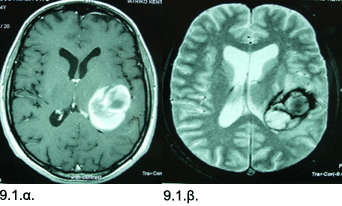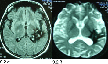 Εικόνες 9.1.α. & 9.1.β. Μαγνητική τομογραφία δείχνει ένα πολύ μεγάλο αιμάτωμα στην κροταφοβρεγματοινιακή συμβολή στο αριστερό εγκεφαλικό ημισφαίριο σε εγκάρσια τομή Τ1 [9.1.α.] και άλλη απεικόνιση Τ2 που δείχνει την περιοχή του αιματώματος και την υποκείμενη βλάβη, δηλ. το σηραγγώδες αιμαγγείωμα του οποίου η ρήξη προκάλεσε την αιμορραγία [9.1.β.].