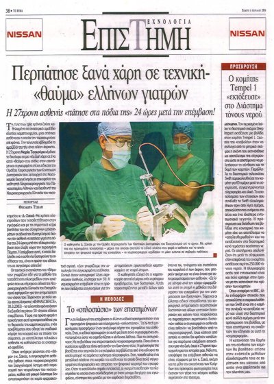 Με χρήση ηλεκτροδίων που τοποθετήθηκαν στον εγκέφαλο και με τη σημαντική χείρα βοηθείας των πιο σύγχρονων μηχανημάτων οι ειδικοί του Ευαγγελισμού έκαναν την ασθενή να πατήσει γερά στα πόδια της 24 ώρες μετά την εξάωρη επέμβαση που έλαβε χώρα την περασμένη Πέμπτη. Η επέμβαση αυτή, η οποία διεξήχθη ενώ η ασθενής διατηρούσε τις αισθήσεις της είναι η πρώτη του είδους της σε παγκόσμιο επίπεδο!