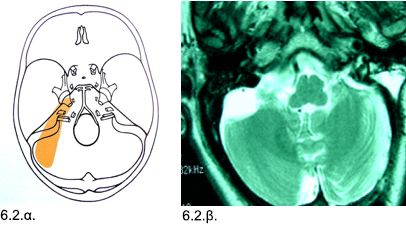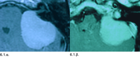 Εικόνες 6.1.α. & 6.1.β. Η μαγνητική τομογραφία δείχνει την μάζα του όγκου στο επίπεδο των ανώτερων κρανιακών νεύρων με τμήμα του όγκου να επεκτείνεται εντός του έσω ακουστικού πόρου (6.1.α.) και σε εγκάρσια τομή στο επίπεδο των κατώτερων ενδοκρανιακών νευρών (6.1.β.).