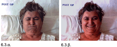 Εικόνες 6.3.α. & 6.3.β. Φωτογραφίες της ασθενούς με σχεδόν συμμετρική έκπτυξη των παρειών και σύγκλειση των οφθαλμών (6.3.α.) και με σχεδόν συμμετρικό χαμόγελο (6.3.β.) δύο ημέρες μετά την επέμβαση, ευρήματα που αποδεικνύουν την αφαίρεση του όγκου χωρίς να προκληθεί πλήγμα του προσωπικού νεύρου. Η σύσπαση των μυών του προσώπου επανήλθε σε απόλυτη συμμετρία σε διάστημα δύο μηνών.